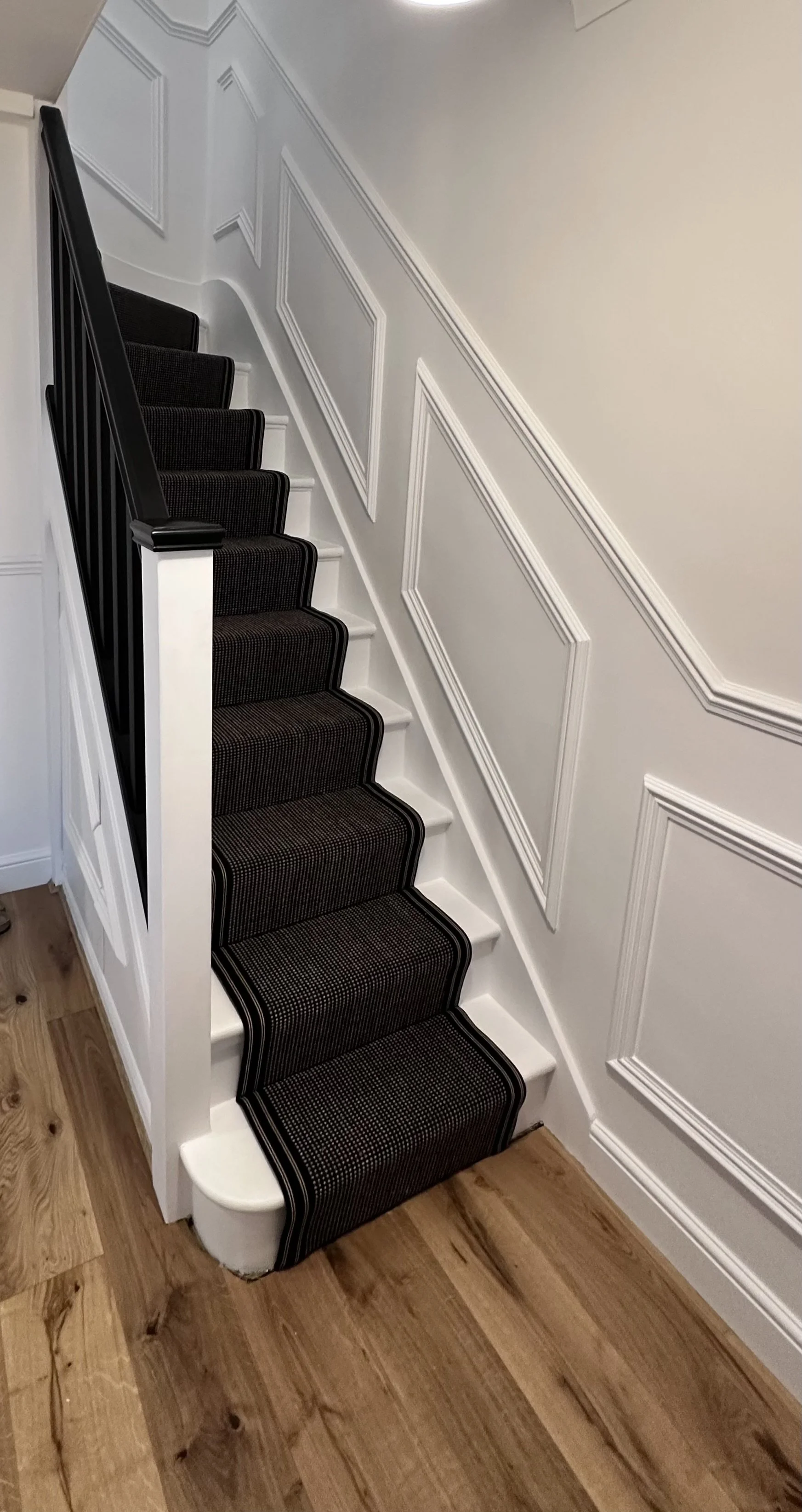 Careful repair, preparation and painting for treads, risers and balustrades. Finished precisely, ready for a carpet runner or to stand alone as a feature.